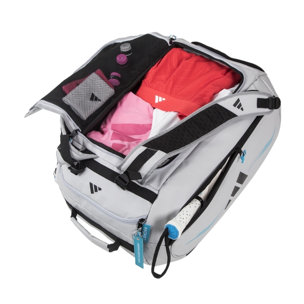 Made with water-repellent panels, adidas Protour is the comfortable padel bag designed by Martita Ortega , ideal for carrying up to 4 rackets without covers, a change of clothes and everything you need for tournaments.