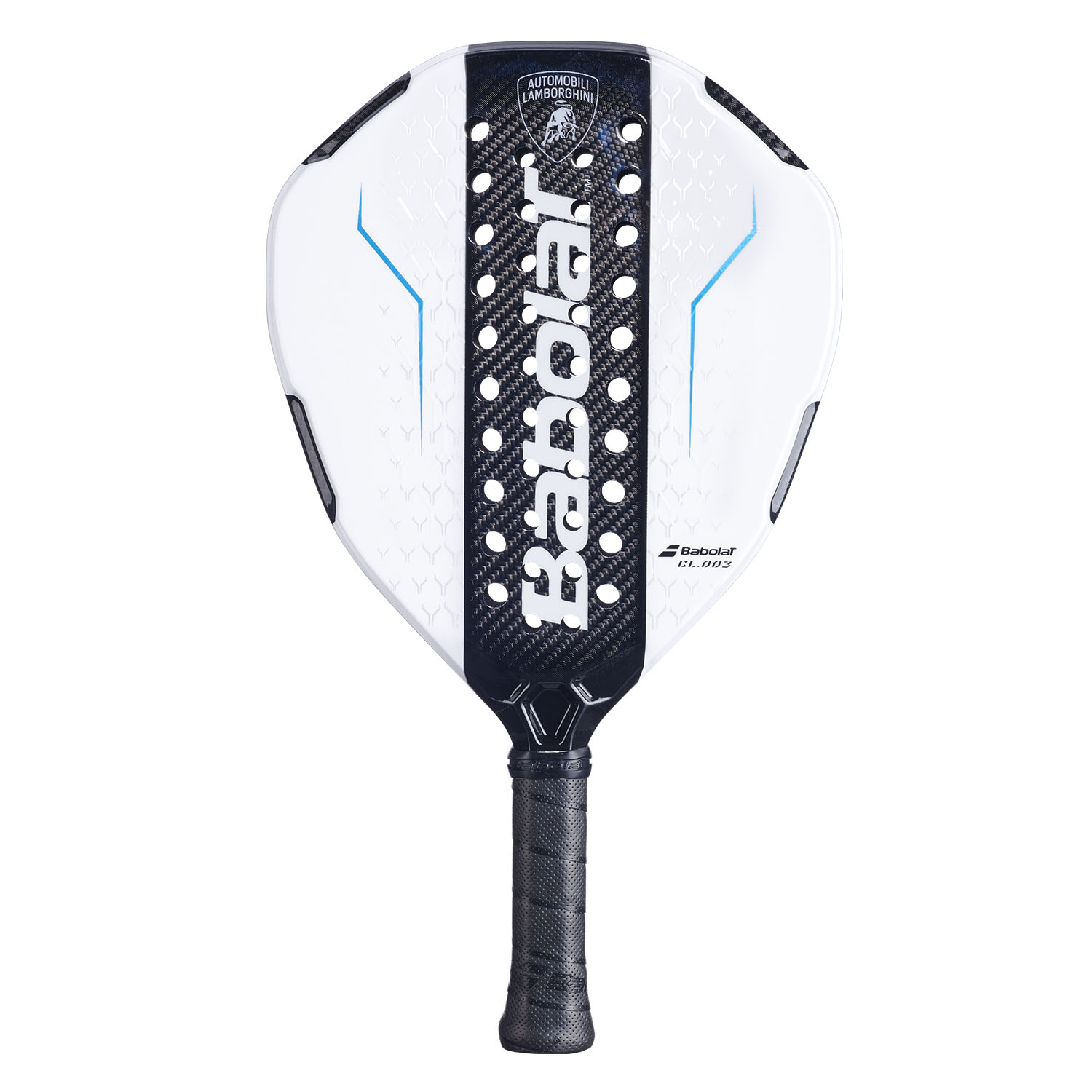 The BL.003 features a cutting-edge aerodynamic structure designed to blend extreme explosiveness with extraordinary maneuverability, offering an elite experience that redefines the concepts of responsiveness, control and luxury on the court. The surface is made of carbon to ensure absolute precision, while the frame is reinforced with KORIDION, an advanced foam derived from patented technologies used in Lamborghini vehicles to ensure stability and responsiveness with every shot. Handcrafted at the prestigious Babolat Padel Studio in Spain, the racket also integrates an thermoplastic coating that optimizes comfort on impact and structural resistance over time.