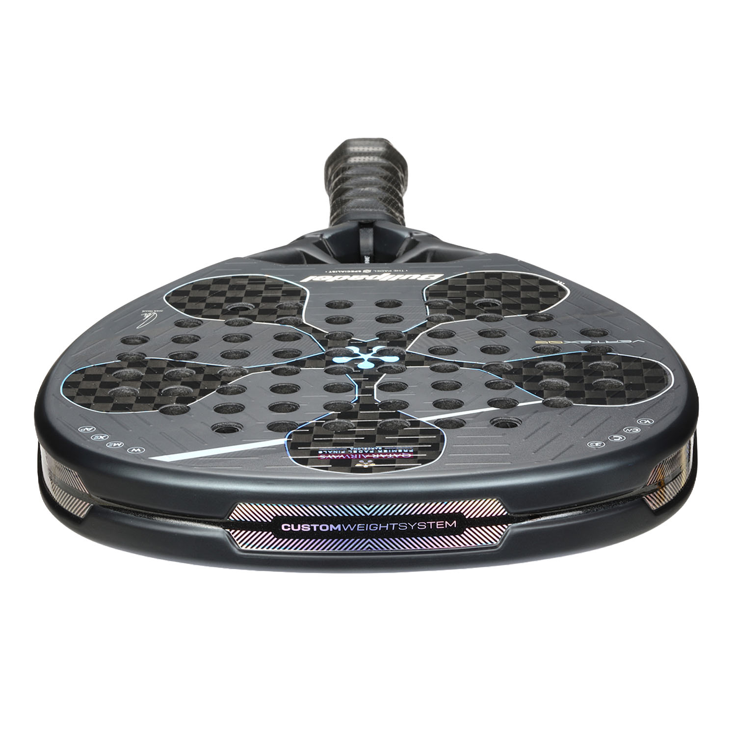 Advanced shock absorbers integrated into four strategic holes on the surface of the blade capable of absorbing up to 49% of the vibrations produced when hitting the ball. Thanks to the redesigned spring-shaped geometry, these shock absorbers not only improve vibration absorption, but also increase overall performance. - Protector CustomWeight