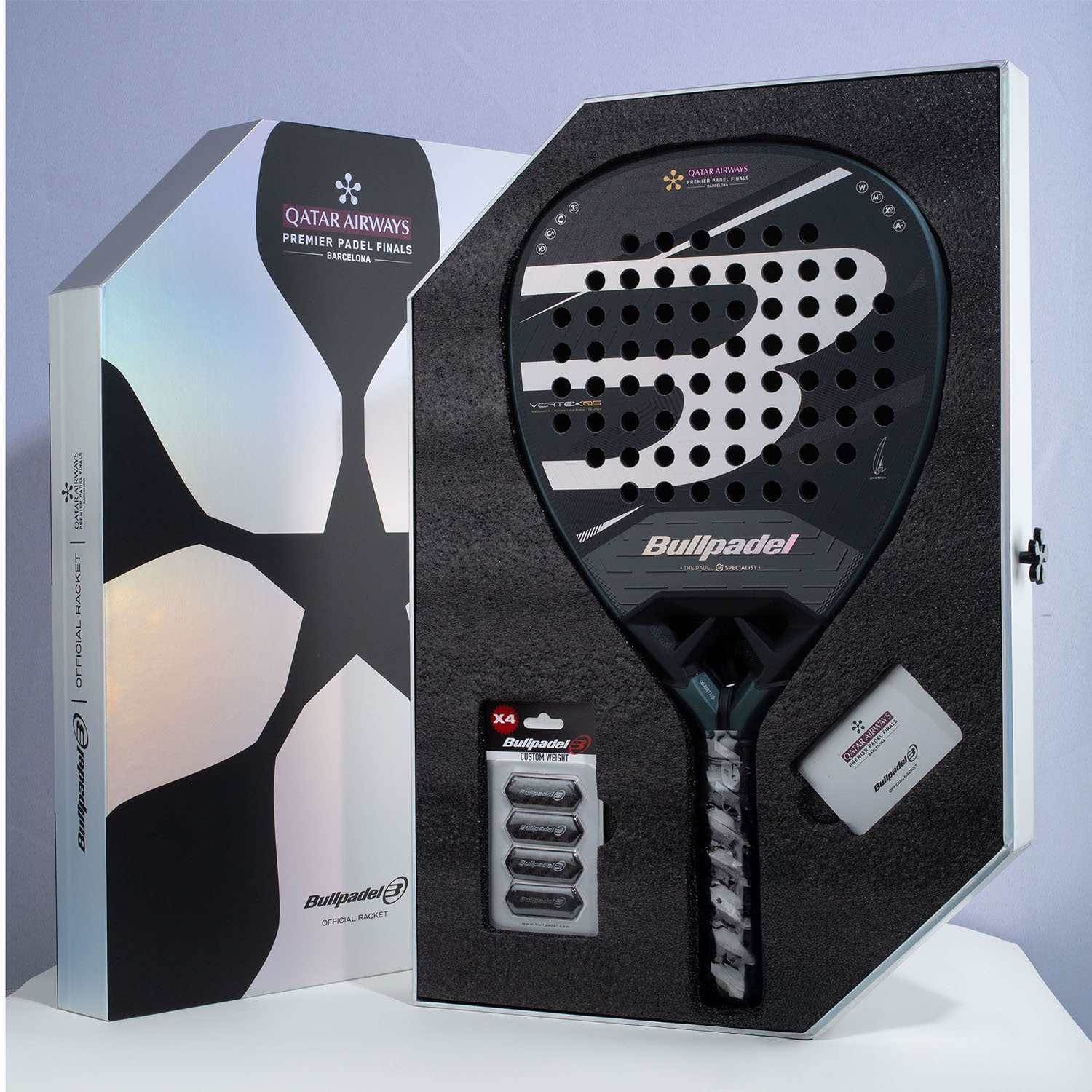 - Rigid pack with Premier Padel Finals Barcelona logo, which contains a pack of Custom Weight protective plates and a unique card to access the Bullpadel Limited Edition Club