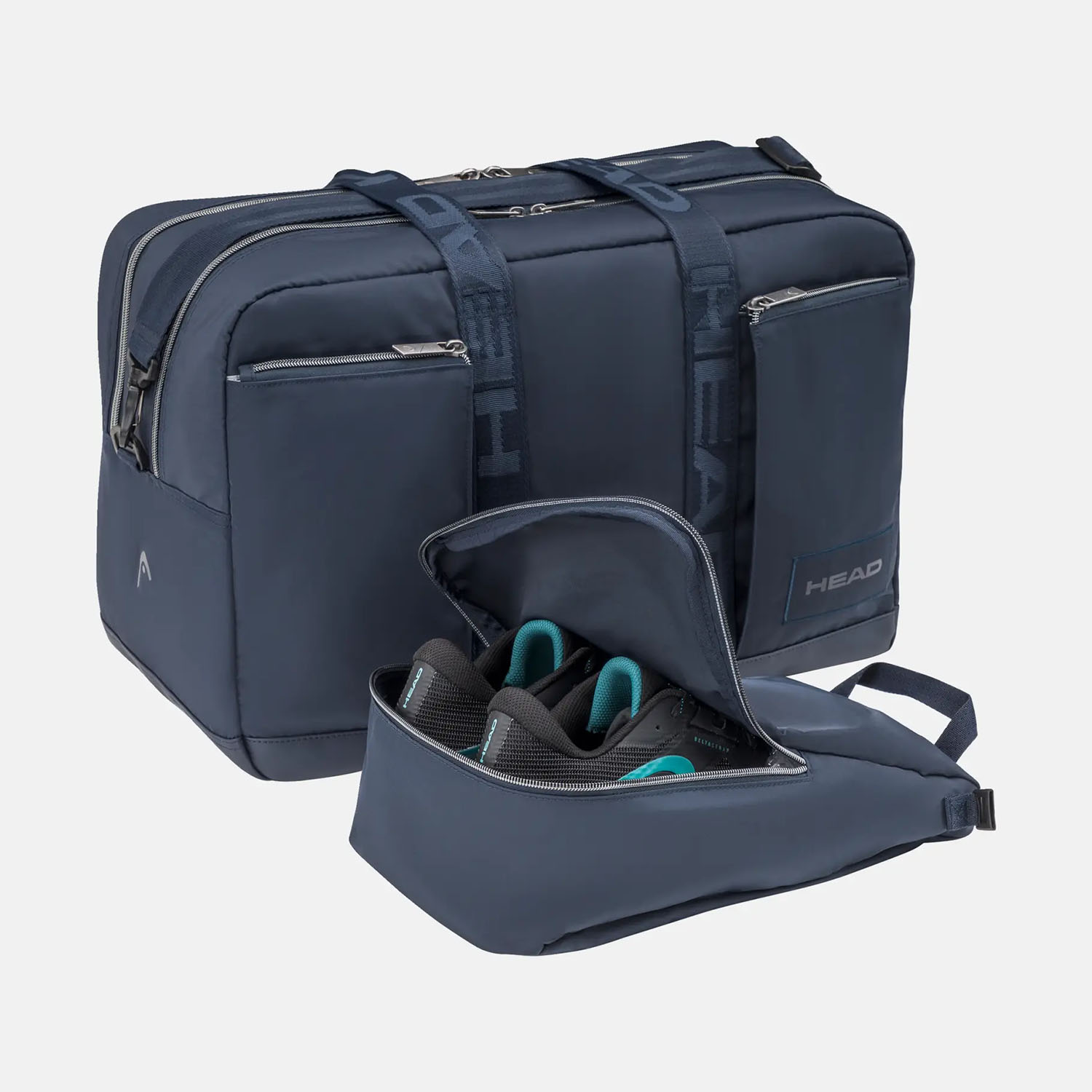 - Large main compartment with zip closure, featuring a felt-lined pocket with Velcro closure for electronic devices, a zip pocket for personal items and a removable shoe bag with two click-closing buckles