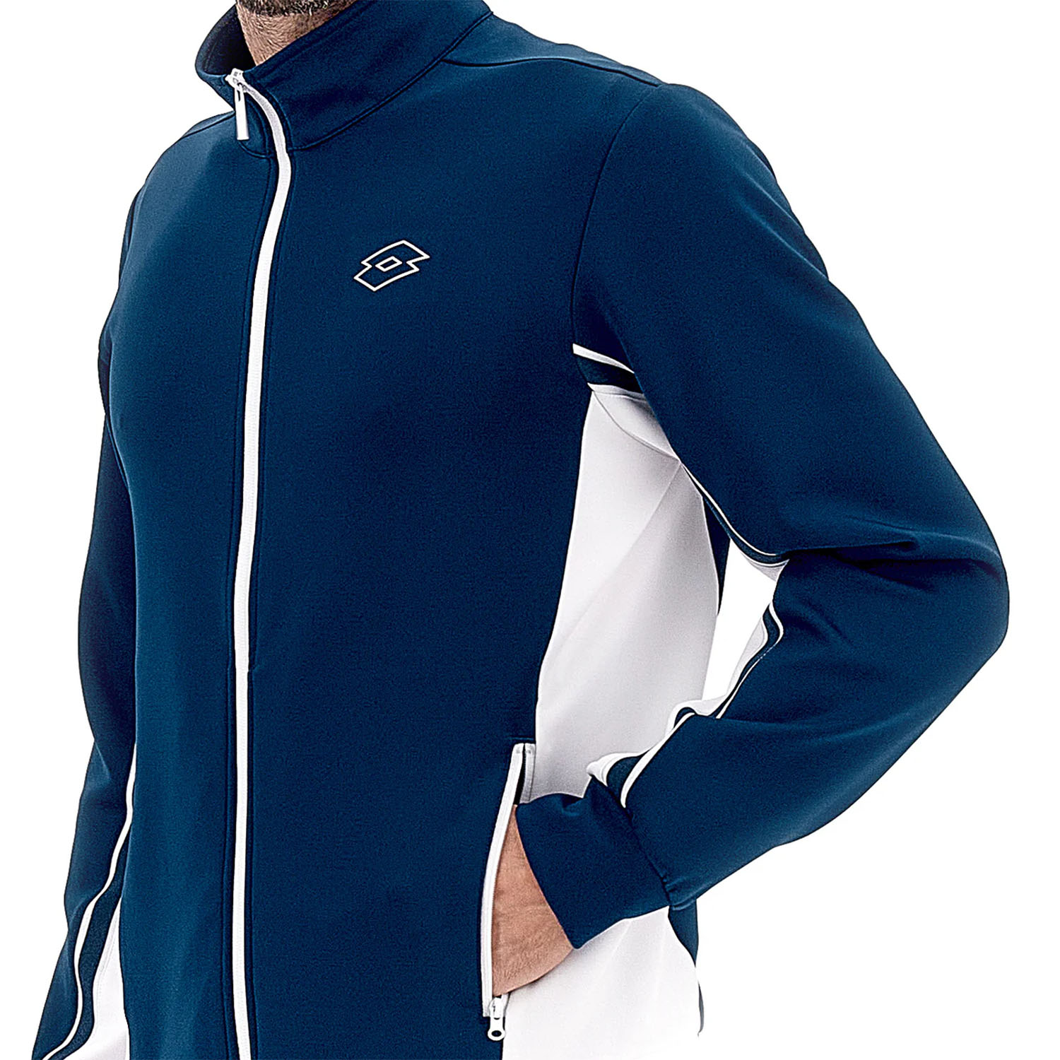 Lotto Squadra III is the men's tennis jacket made of super-stretch, smooth-to-the-touch technical fabric, designed to offer maximum freedom of movement and ideal comfort during warm-up and recovery, before and after the match.
