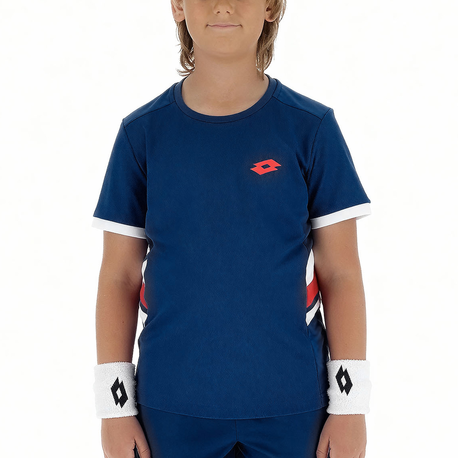 La camiseta de tenis Lotto Squadra III para niños está confeccionada íntegramente en malla ligera y transpirable diseñada para garantizar a los pequeños jugadores toda la frescura y libertad de movimientos que necesitan.