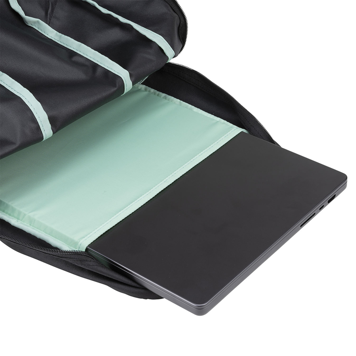 - El compartimento principal con cremallera bidireccional cuenta con un bolsillo abierto para guardar una computadora portátil de forma segura y accesible