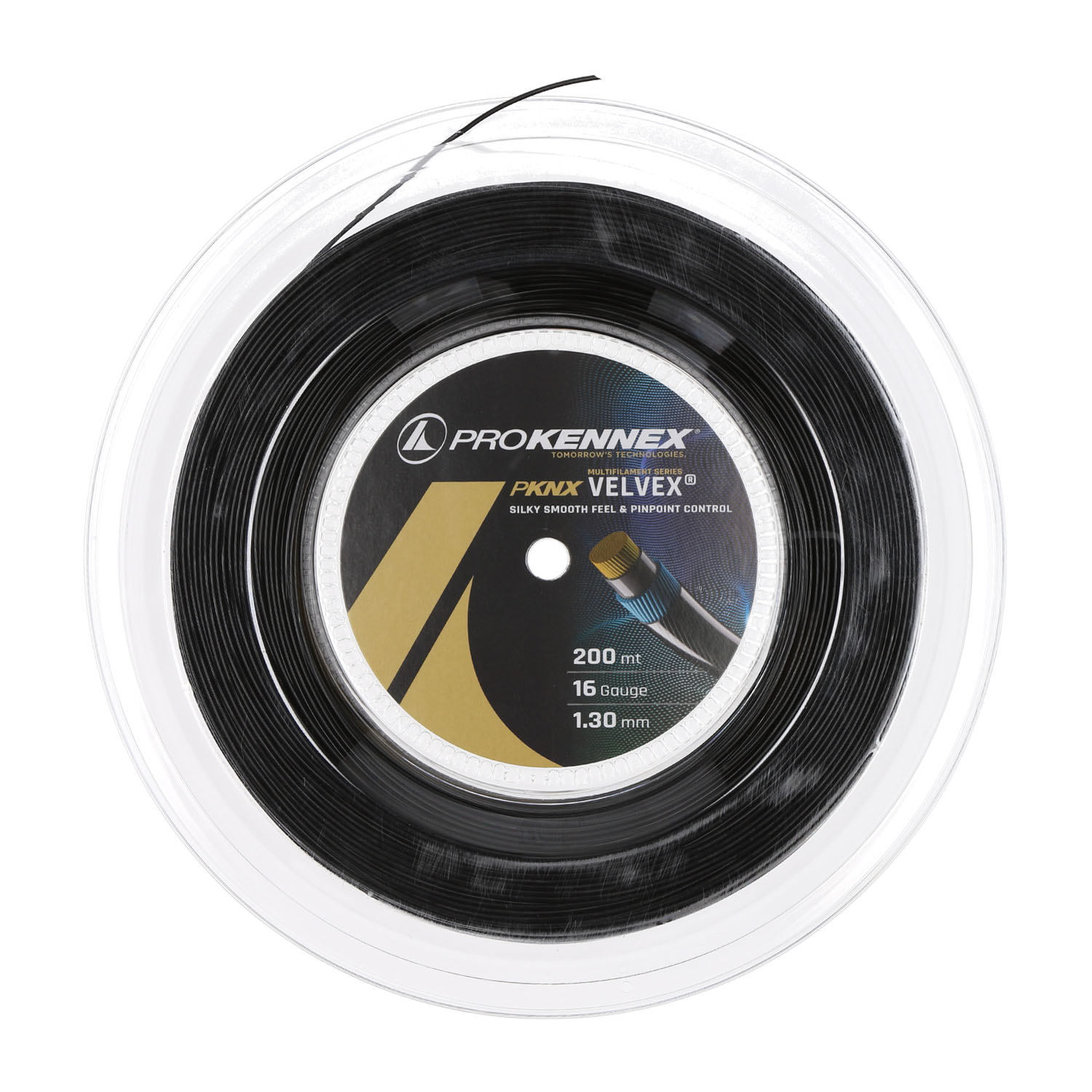 El cordaje multifilamento ProKennex Velvex para tenis combina una resina TPU suave con PA-66, un material altamente flexible, para reproducir de la mejor manera la elasticidad y la sensación de la tripa natural.